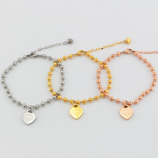TEM26 Fashion Stainless Steel Heart-shaped Pendant and Round Bead Bracelet Bangle Bague Femme for Woman Gift